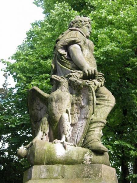 Wandert der Blick an ihrem Gewand herunter, so bleibt er unweigerlich an Germanias rechtem Fuß hängen. Dieser ist auf einem Kanonenrohr positioniert – eine eindeutige Pose der Unterdrückung. Doch was unterdrückt Germania? Die Einschneidungen auf dem Kanonenrohr geben darüber Aufschluss: Die Krone und das große „N“ sind Kaiser Napoleon III. von Frankreich zuzuordnen. Die Unterjochungs-Geste bezieht sich also auf die Nation Frankreich. Um den Sieg der Deutschen und die Unterjochung des französischen Erbfeindes nun gänzlich im Bildgedächtnis des Betrachters und der Betrachterin zu manifestieren, hockt zudem ein Reichsadler mit riesigen Krallen und gespreizten Flügeln auf dem französischen Kanonenrohr. Die Botschaft ist eindeutig: Die Deutschen haben die Franzosen nicht nur vernichtend geschlagen, sie sichern zudem den Frieden. Die französischen Waffen sind unschädlich gemacht worden und werden von den deutschen Genien bewacht. Die junge Nation Deutschland kann sich nun ganz auf ihre friedvolle Vereinigung fokussieren.