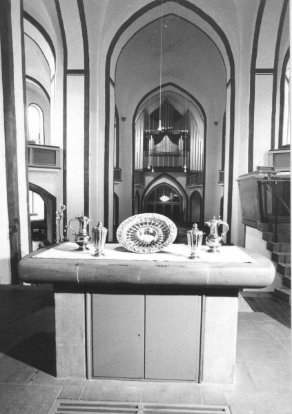 Die Taufschale der Nikolaikirche ist eine kunstgeschichtliche Besonderheit und das einzig erhaltene Beispiel peruanischer Goldschmiedekunst der frühen Kolonialzeit. Es handelt sich um eine innen vergoldete Silberschale mit einem Durchmesser von 54 cm, die gegen Ende des 16. Jahrhunderts in einer Inka-Werkstatt in Potosí (Peru) hergestellt wurde. Stilistisch zeigt die Schale indianische Motive, lässt aber auch europäische Einflüsse der spanischen Herrschaft in Peru erkennen. Als Zahlungsmittel gelangte die Schale nach Afrika, vermutlich über die peruanische Hochebene Altiplano und Brasilien. Sie diente sehr wahrscheinlich der Bezahlung von Sklaven für die spanischen Kolonien in Südamerika. Der kongolesische Herrscher Dom Garcia II. Alfonso schenkte die Schale zusammen mit 200 Sklaven Johann Moritz von Nassau-Siegen, dem Gouverneur von Niederländisch-Brasilien. Es handelte sich um ein diplomatisches Geschenk als Dank für die Vermittlung in einem Konflikt und die Anbahnung guter Beziehungen im transatlantischen Sklavenhandel. Der niederländische Gelehrte Caspar Barlaeus, der 1647 ein Werk über die Regierungszeit des Johann Moritz in Brasilien verfasste, schrieb über die Gastgeschenke der afrikanischen Delegation: