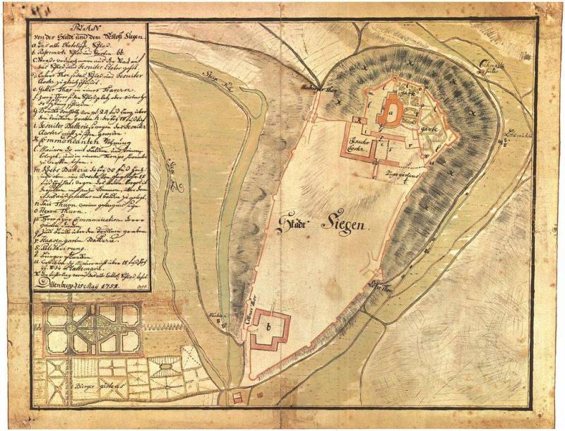 Auf diesem Plan der Stadt Siegen aus dem Jahr 1751 ist der Herrengarten unten links zu sehen.