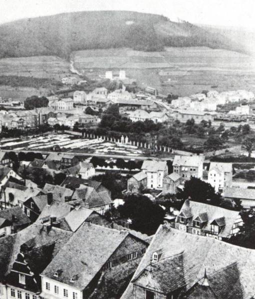 Diese Aufnahme aus dem Jahr 1910 zeigt das durch die Bahntrasse zerteilte und überbaute Gelände des Herrengartens. Auf dem dreieckigen Platz davor haben Siegener Bürgerinnen und Bürger Wäsche zum Bleichen ausgelegt.