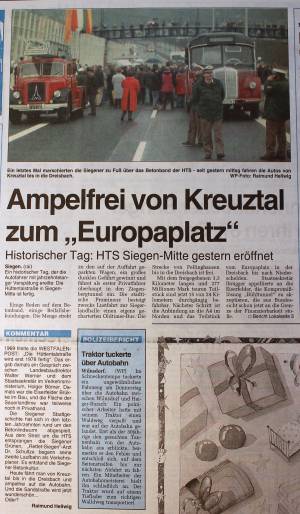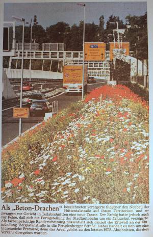 Früh war allen Beteiligten klar, dass die Hüttentalstraße das Stadtbild Siegens tiefgreifend verändern würde. Die Westfalenpost fasste den Grundtenor der Diskussion über die HTS bereits 1991 in der Überschrift „Traumstraße oder Alptraum“2) zusammen. Der Autor des Artikels stellte die Frage, ob es sich bei der HTS um eine gelungene, nutzbare Stadtautobahn oder einen von „gigantomanischen Bürokraten“ ins Leben gerufenen Alptraum handele.
